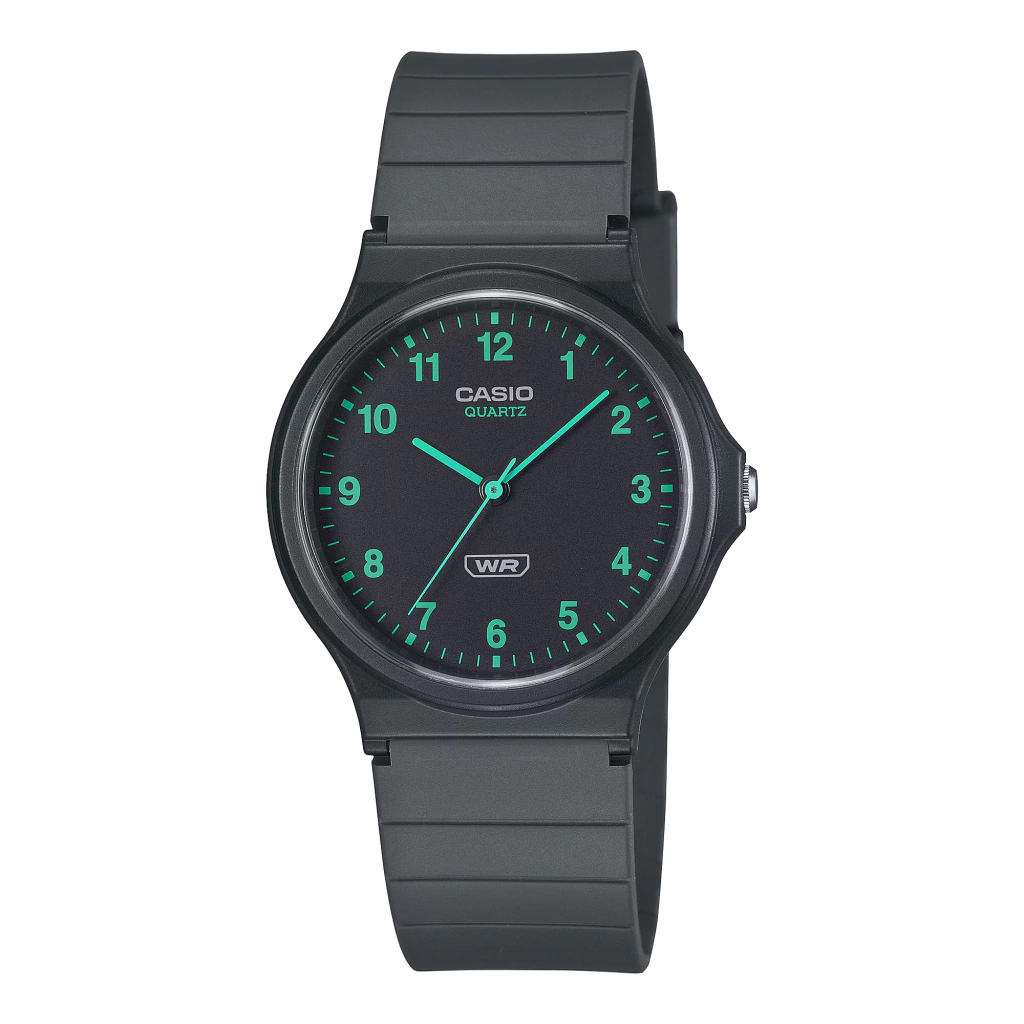 El modelo éxito en ventas MQ-24 está de vuelta, ahora fabricado con materiales más responsables con el medioambiente. El diseño de las manecillas de hora, minuto y segundos presenta números de índice simples en una línea de diferentes esquemas de colores monocromáticos, todos pulidos para un aspecto y sensación minimalista y delgado. La correa está fabricada con resina de origen biológico, un material que se espera que ayude a reducir el impacto ambiental.